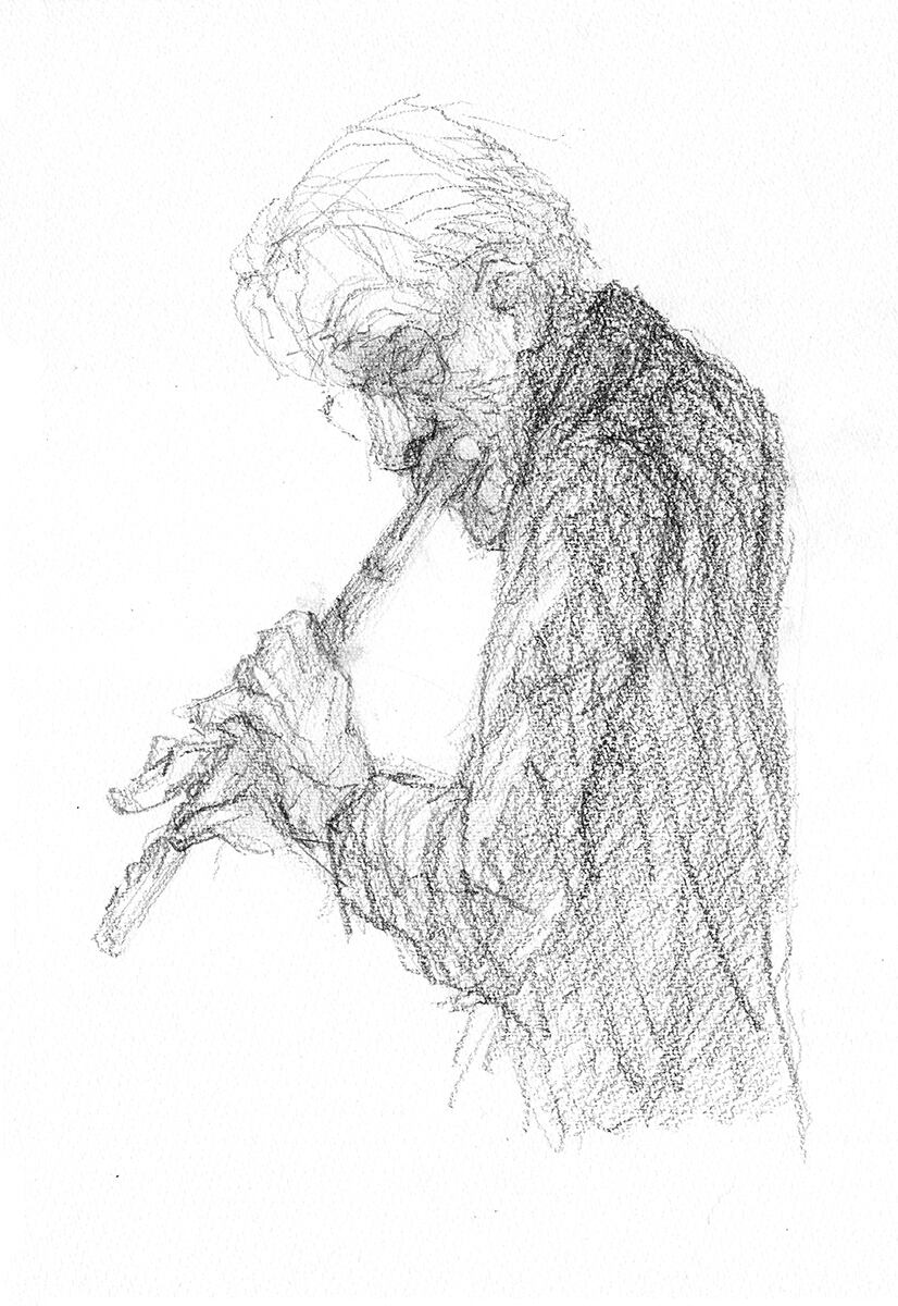 進藤一茂によって鉛筆で描かれたフルーティスト白尾隆氏の肖像画をデジタル化したものです。